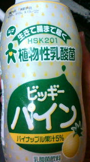 え、これバリエーションあんの? パイン味もまた。 5㌫しか入ってない果汁の割に濃厚に香るパインに、トロッとした口当たりが相俟って非常に体に悪いモノに思える乳酸菌飲料(笑)。 その背徳感がまたビッギーの魅力なのですが。 言っても僕、昔ビックル一気飲みして盛大に嘔吐したことありますからね。 ドッキドキです。 お母さんごめん。 そんな 「うしろめた飲料」。 (朝から何書いてんだろ…)