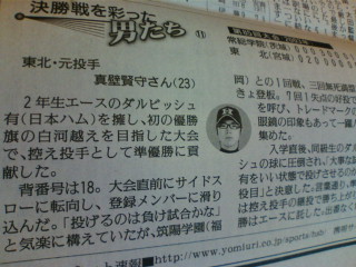 今朝の新聞(読売)に、03、04年の甲子園で活躍した元東北高校の真壁君が載ってましたよ。(写真)
